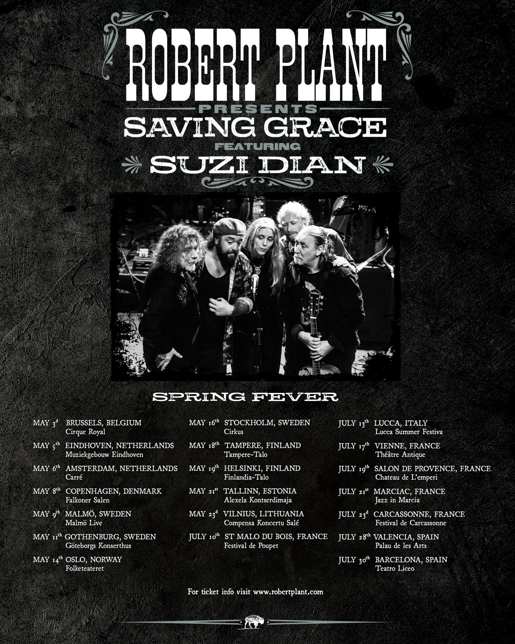Robert Plant (Led Zeppelin) and his backing band Saving Grace (feat. Suzi Dian) have announced a European tour. The trek will take place across two legs with part one scheduled for May and part two scheduled for July.