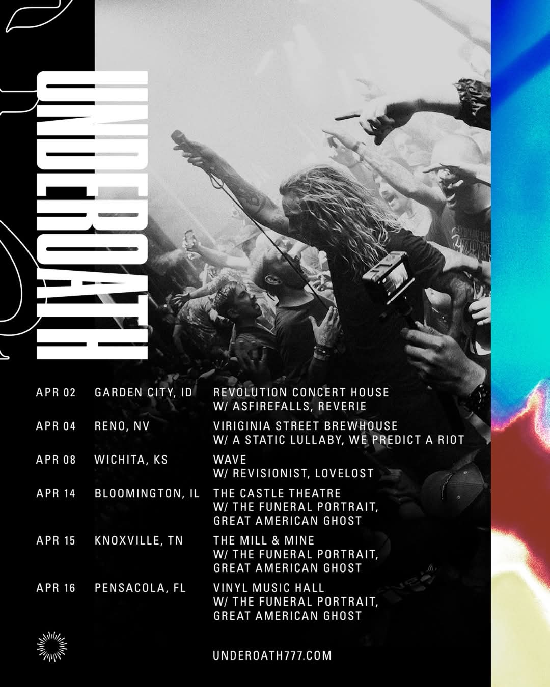 Underoath have revealed the opening acts for their April headlining shows. Among them are: AsFireFalls, Reverie, Static Lullaby, We Predict A Riot, Revisionist, LoveLost, The Funeral Portrait, and Great American Ghost. Here’s the dates along with the supporting acts: