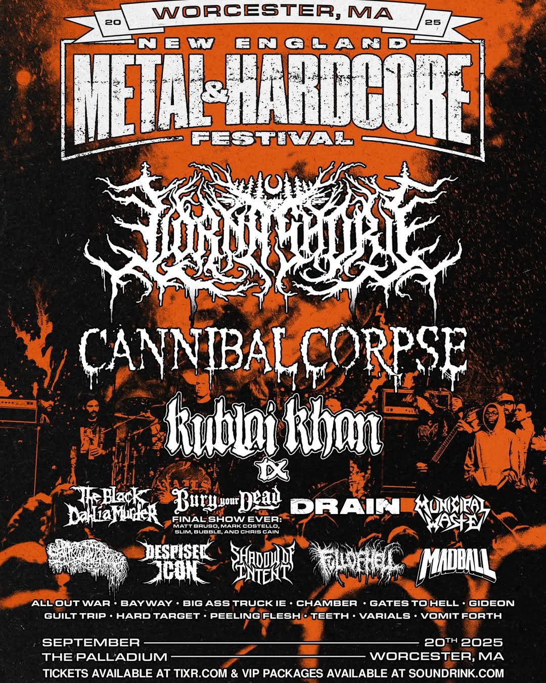 The lineup has been revealed for this year’s New England Metal & Hardcore Festival. The event will take place at The Palladium Outdoors in Worcester, MA on September 20 and it will feature the following: Lorna Shore, Cannibal Corpse, Kublai Khan TX, The Black Dahlia Murder, Bury Your Dead, Drain, Municipal Waste, Sanguisugabogg, Despised Icon, Shadow of Intent, Full Of Hell, Madball, All Out War, Bayway, Big Ass Truck, Chamber, Gates To Hell, Gideon, Guilt Trip, Hard Target, PeelingFlesh, Teeth, Varials, and Vomit Forth.