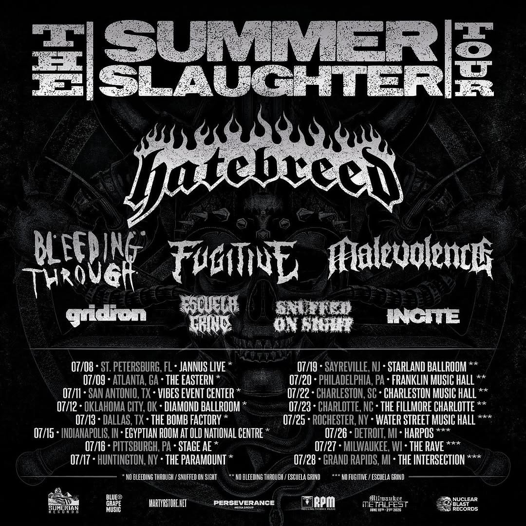 The lineup has officially been revealed for the 2025 Summer Slaughter Tour. The July trek will find headliners Hatebreed joined by Bleeding Through, Fugitive, Malevolence, Gridion, Escuela Grind, Snuffed On Sight, and Incite on select dates.