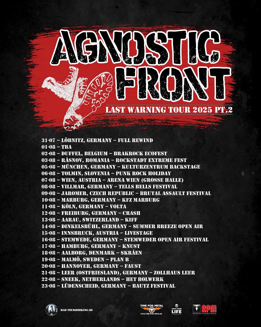 Agnostic Front have announced the dates for their “Last Warning” European tour. That trek will take place in August.