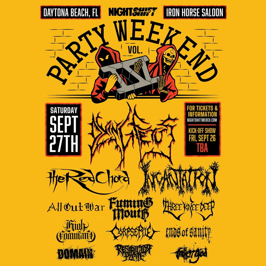 The lineup has been revealed for this year’s Party Weekend festival. The event will take place at The Iron Horse Saloon in Daytona Beach, FL on September 27 and it will feature: Dying Fetus, The Red Chord (“Clients” 20th anniversary set), Incantation, All Out War, Fuming Mouth, Three Knee Deep, High Command, Corpse Pile, Ends Of Sanity, Domain, Restrictor Plate, and Fallen God.