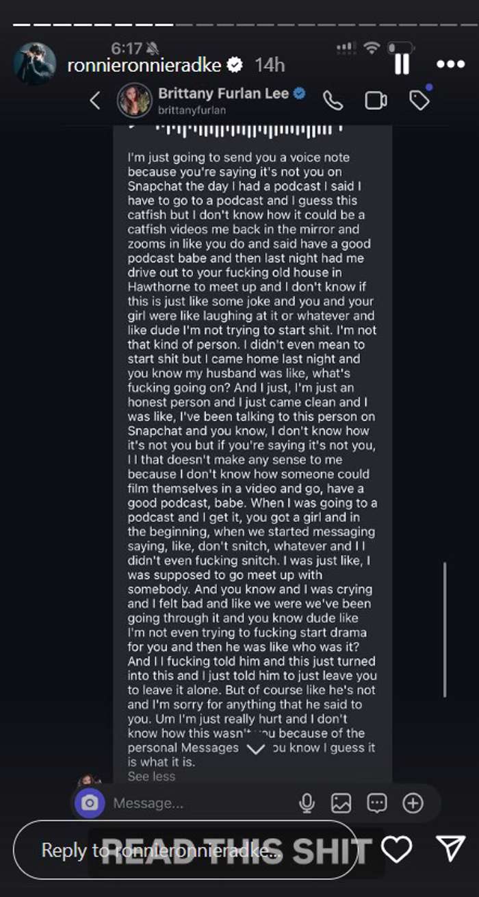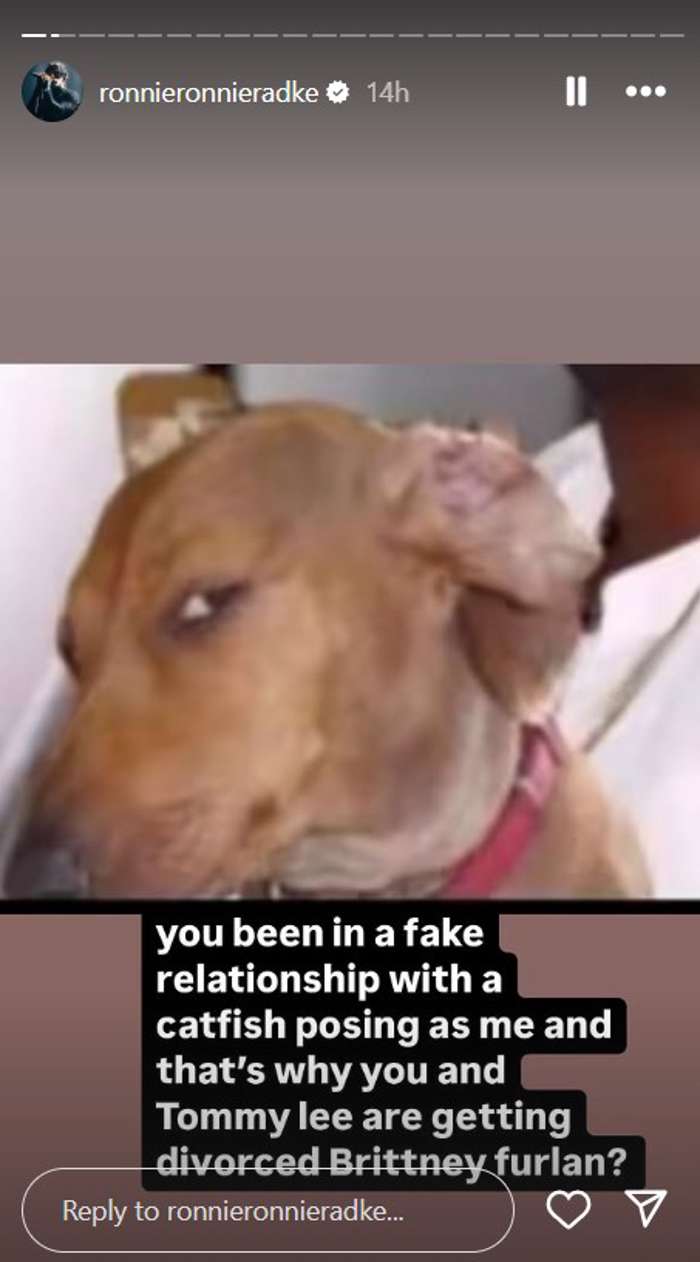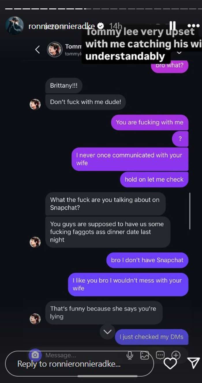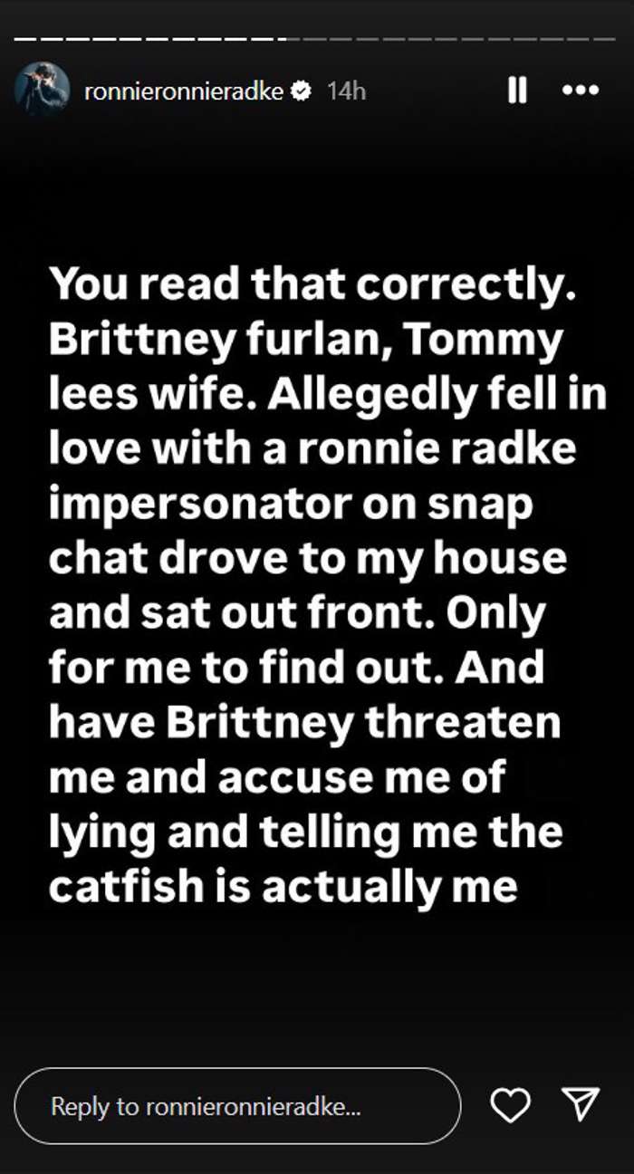 Falling In Reverse frontman Ronnie Radke seems to have gotten tangled up in the rift between Mötley Crüe drummer Tommy Lee and his estranged wife Brittany Furlan. The issue stems from an apparent catfish situation that saw someone pretending to be Radke on Snapchat. Furlan was allegedly messaging the imposter and even showed up at Radke’s house following the communication. Radke has since detailed the situation through his Instagram stories: