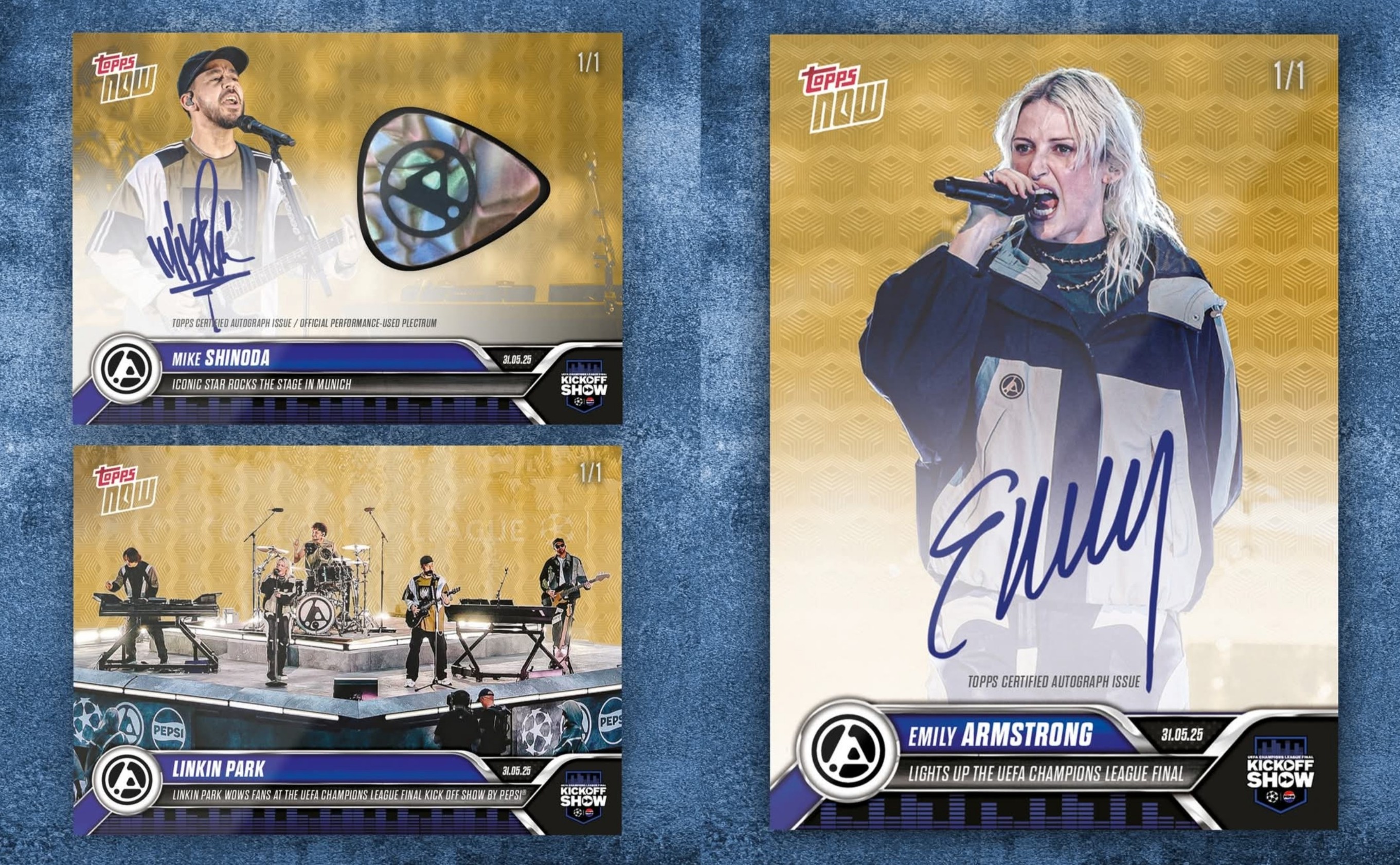 Linkin Park have announced their own collection of Topps trading cards. The collectibles feature photos from the band’s recent performance at the UEFA Champions League Final in Munich, Germany. This includes a card featuring the full band, a card featuring Emily Armstrong, and a card featuring Mike Shinoda. You can find those HERE.