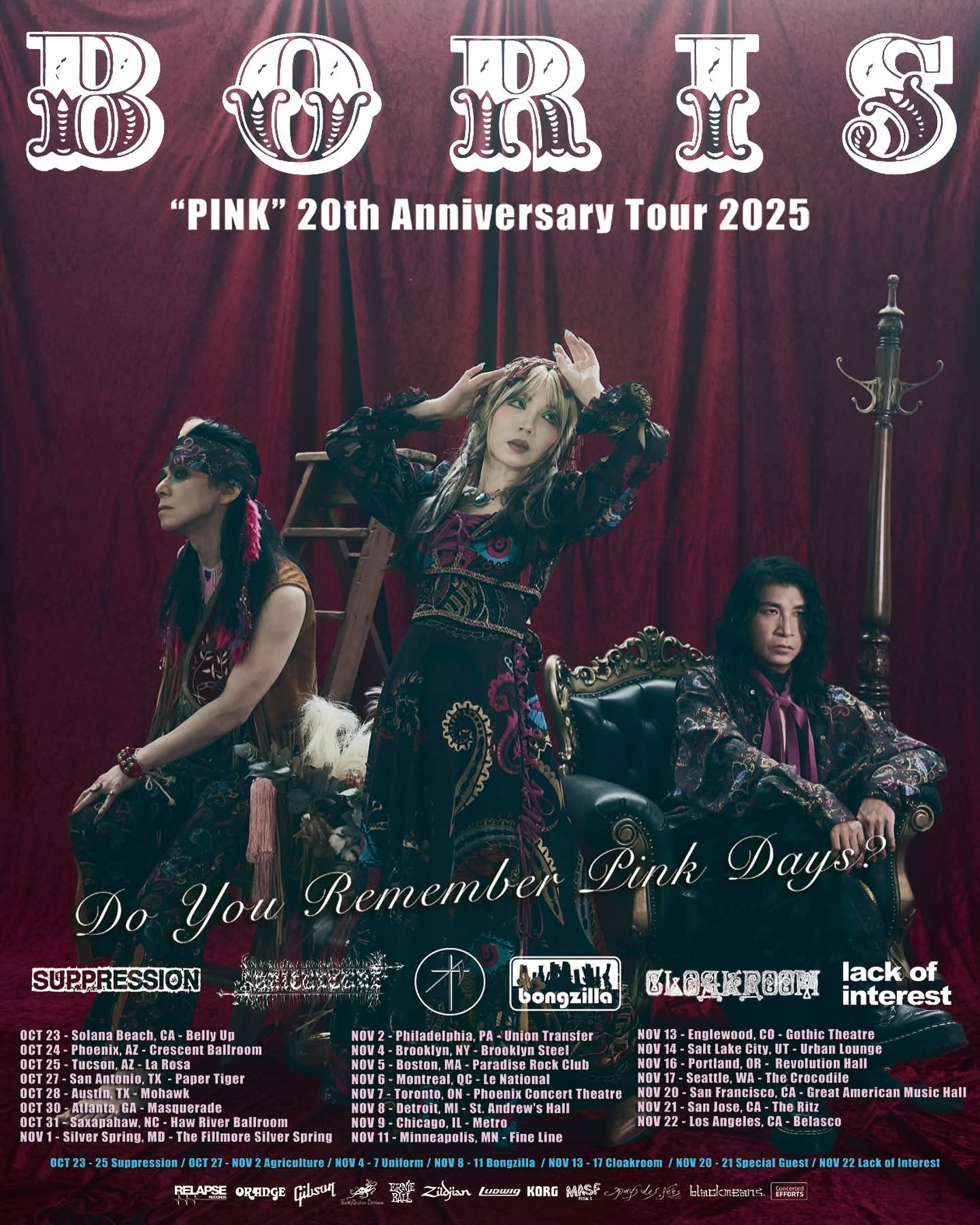 Boris will be celebrating the 20th anniversary anniversary of “Pink” during a headlining North American tour. Uniform, Bongzilla, Cloakroom, Agriculture, Suppression, and Lack Of Interest will open on select dates.