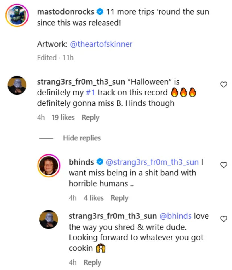 Ex-Mastodon guitarist/vocalist Brent Hinds recently blasted his former bandmates in the comment section of a post regarding the 11th anniversary of “Once More Round The Sun.” The musician had the following exchange with a fan: