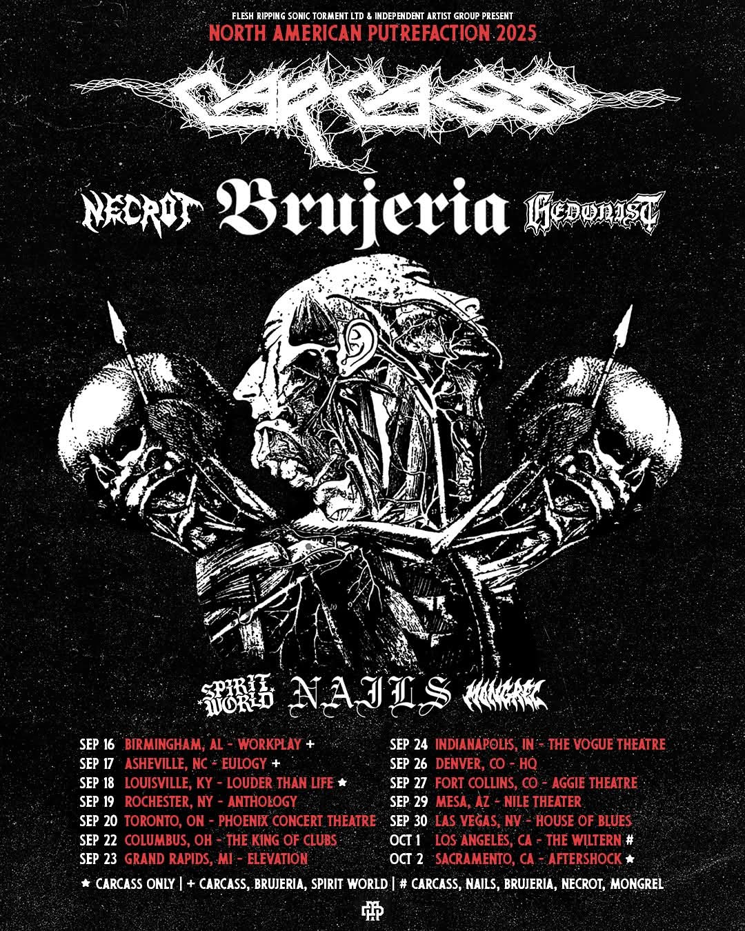 Carcass have announced fall North American tour. Brujeria, Necrot, Hedonist, SpiritWorld, Nails, and Mongrel will serve as support on select dates.