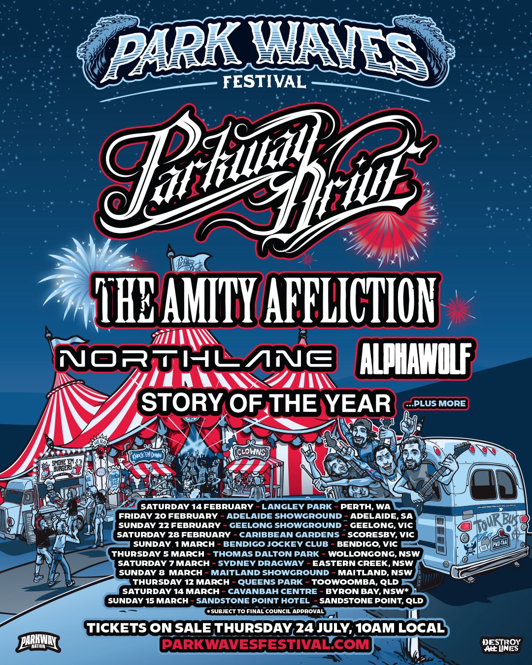 Parkway Drive have revealed the lineup for next year’s Park Waves festival. The event will take place in February/March and it will find Parkway Drive joined by The Amity Affliction, Northlane, Alpha Wolf, Story Of The Year, and more to be announced. Here’s the dates: