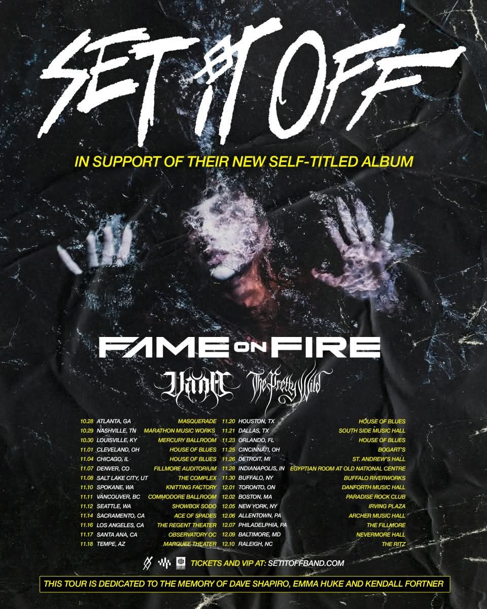 “It’s been a while since we’ve been able to do an entire headline tour on the back of a brand new album and we can’t WAIT get back on the road and celebrate the release of our first completely independent self-titled album with all of our amazing fans! This album was made with our live show in mind. The energy level of these shows is going to be out of control and we can’t wait for you to see why we named ourselves Set It Off in the first place! On top of that, we are bringing with us three amazing artists in Fame On Fire, Vana and The Pretty Wild! We are genuinely fans of all of them and we all can’t wait to give you the show of a lifetime! So grab tickets while you still can, because these shows are going to sell out.”