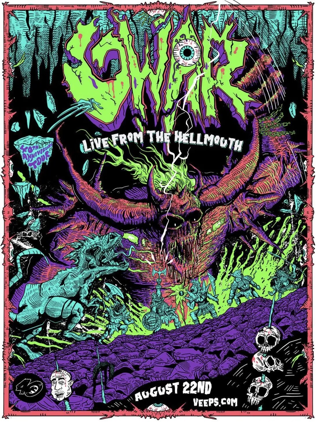 “GWAR coming at you live from the very gates of hell. Talk about a shitty gated community, who runs this HOA? We decided to do a gig at a real live hellmouth at the Caverns in Pelham, Tennessee. Not since Buffy the Vampire Slayer has a hellmouth seen so much death and destruction. We kicked the devil’s ass, and now you can watch a video stream of the whole bloody affair!”