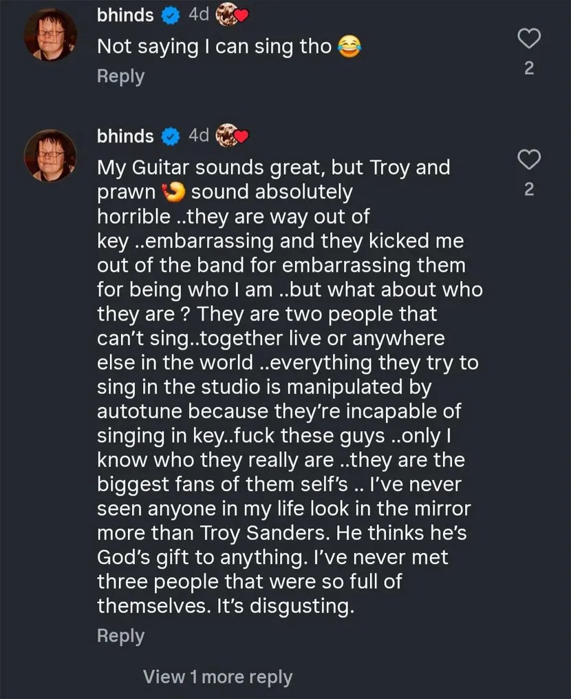 “My Guitar sounds great, but Troy [Sanders] and prawn [an apparent nickname for Brann Dailor] sound absolutely horrible ..they are way out of key ..embarrassing and they kicked me out of the band for embarrassing them for being who I am ..but what about who they are ? They are two people that can’t sing..together live or anywhere else in the world ..everything they try to sing in the studio is manipulated by autotune because they’re incapable of singing in key..fuck these guys ..only I know who they really are ..they are the biggest fans of them self’s .. I’ve never seen anyone in my life look in the mirror more than Troy Sanders. He thinks he’s God’s gift to anything. I’ve never met three people that were so full of themselves. It’s disgusting.”