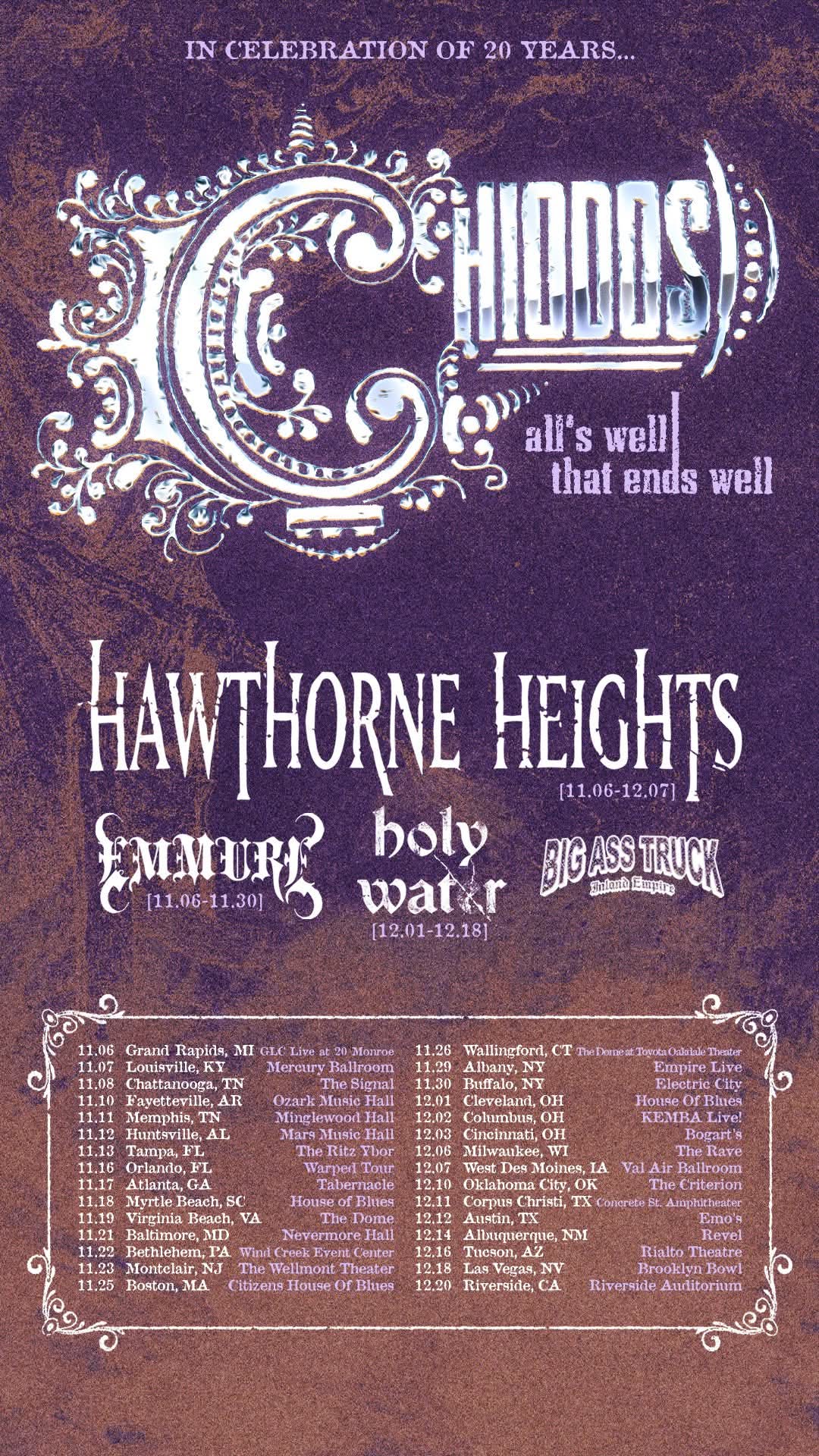 Chiodos have announced the second leg of their “All’s Well That Ends Well” 20th Anniversary tour. The trek will take place this fall and it will also feature Hawthorne Heights, Emmure, Holywatr, and Big Ass Truck IE on select dates.