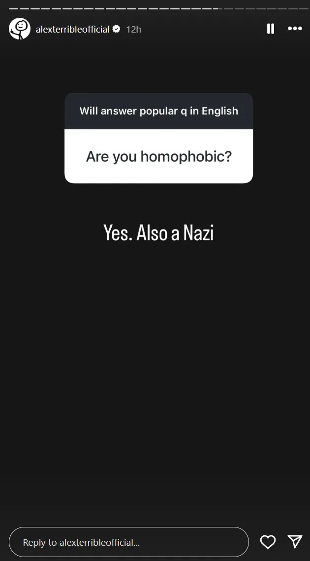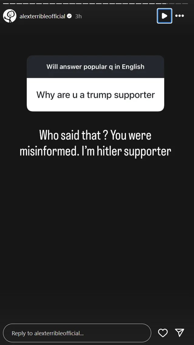Alex: “Who said that? You were misinformed. I’m Hitler supporter.”