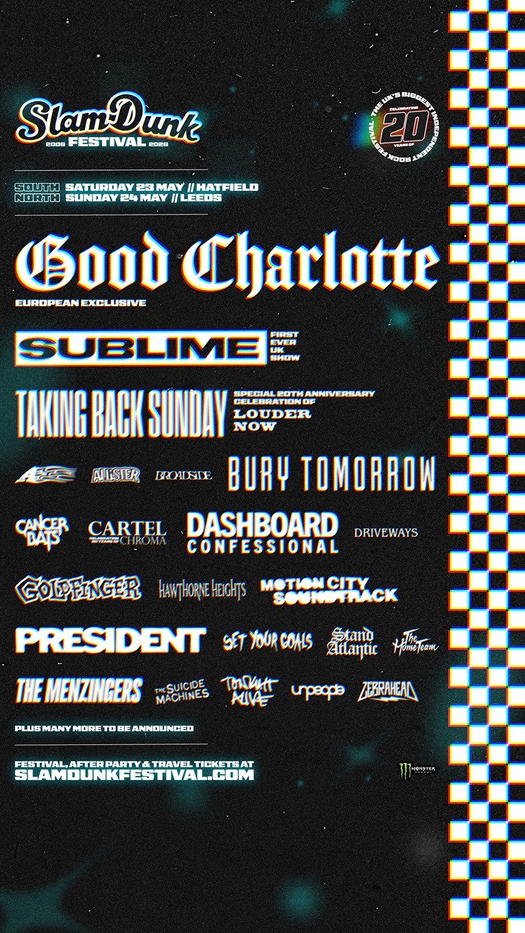 The initial lineup has been revealed for next year’s Slam Dunk Festival. The event, which will take place at Hatfield Park in Hatfield, UK on May 23 and at Temple Newsam in Leeds, UK on May 24, will feature: Good Charlotte, Sublime, Taking Back Sunday (“Louder Now” 20th anniversary set), Cartel (“Chroma” 20th anniversary set), Dashboard Confessional, Motion City Soundtrack, Cancer Bats, Bury Tomorrow, PRESIDENT, Goldfinger, The Suicide Machines, Zebrahead, Stand Atlantic, The Home Team, The Menzingers, Set Your Goals, Tonight Alive, unpeople, Hawthorne Heights, Driveways, Broadside, A, and Allister.