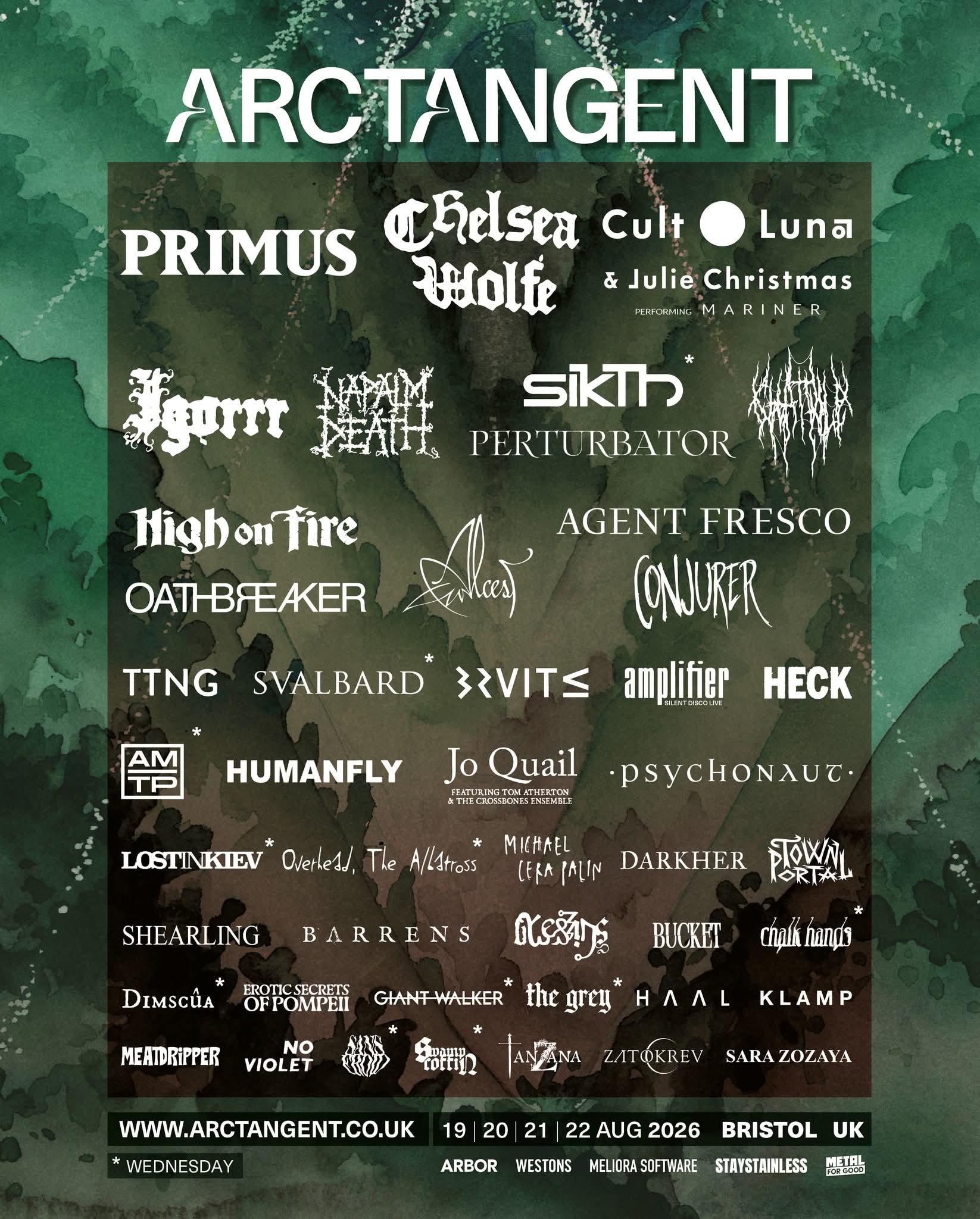 More bands have been added to next year’s ArcTanGent Festival. That event will take place at Fernhill Farm in Bristol, UK on August 19-22 and it will now feature the following: Primus, Chelsea Wolfe, Cult Of Luna & Julie Christmas (performing “Mariner“), Igorrr, Napalm Death, SikTh, Perturbator, Chat Pile, High On Fire, Agent Fresco, Oathbreaker, Alcest, Conjurer, TTNG, Svalbard, BRUIT ≤, Amplifier (“Silent Disco” set), Heck, Alpha Male Tea Party, Humanfly, Jo Quail (feat. Tom Atherton & The Crossbones Ensemble), Psychonaut, Lost In Kiev, Overhead, The Albatross, Michael Cera Palin, Darkher, Town Portal, Shearling, Barrens, Blessings, Bucket, Chalk Hands, Dimscûa, Erotic Secrets Of Pompeii, Giant Walker, The Grey, HAAL, Klamp, Meatdripper, No Violet, Sans Froid, Swamp Coffin, Tanzana, Zatokrev, and Sara Zozaya.