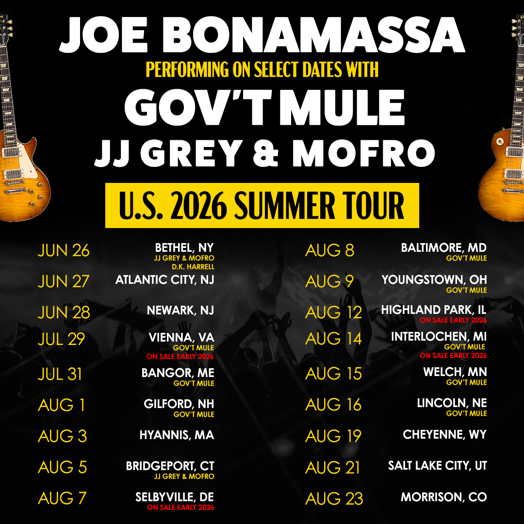 Joe Bonamassa has announced a summer 2026 U.S. tour. You can find the dates for that run below. Gov’t Mule, JJ Grey & Mofro, and D.K. Harrell will join him at select shows.