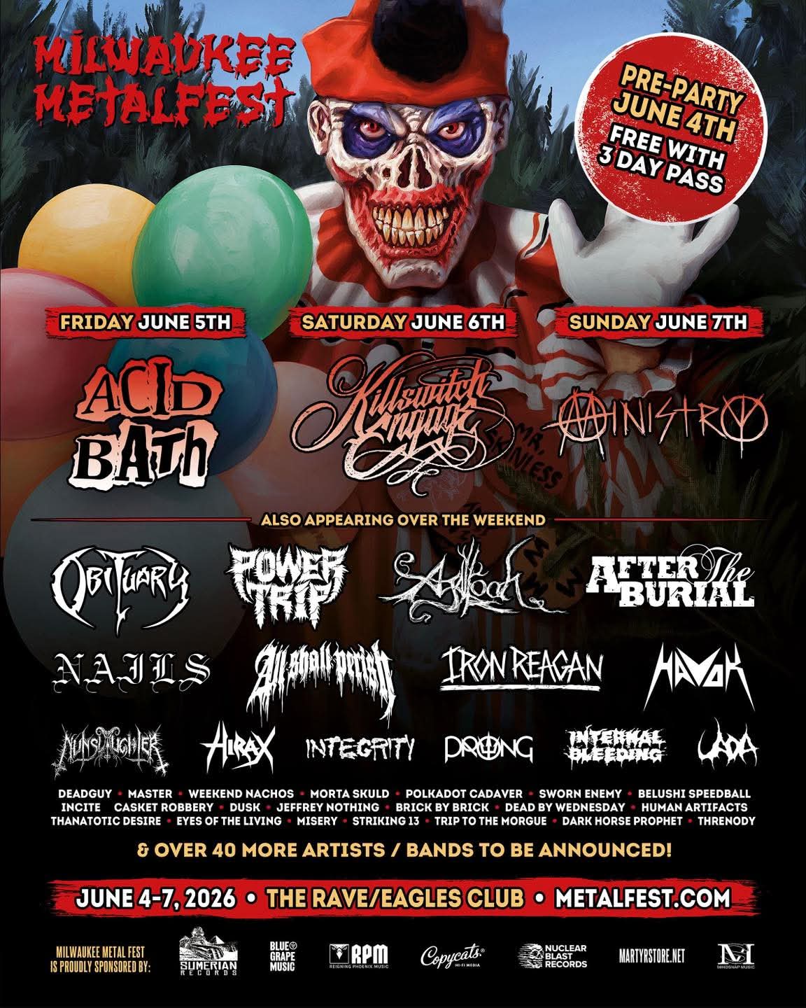 More bands have been added to next year’s Milwaukee Metal Fest. That event will take place at The Rave/Eagles Ballroom in Milwaukee, WI on June 5-7. A pre-party is also being scheduled for June 4. The updated lineup includes: Acid Bath, Killswitch Engage, Ministry, Obituary, Power Trip, Agalloch, After The Burial, All Shall Perish, Nails, Iron Reagan, Havok, Nunslaughter, Hirax, Integrity, Prong, Internal Bleeding, UADA, Deadguy, Master, Weekend Nachos, Morta Skuld, Polkadot Cadaver, Sworn Enemy, Belushi Speedball, Incite, Casket Robbery, Dusk, Jeffrey Nothing, Brick By Brick, Dead By Wednesday, Human Artifacts, Thanatotic Desire, Eyes Of The Living, Misery, Striking 13, Trip To The Morgue, and Dark Horse Prophet.