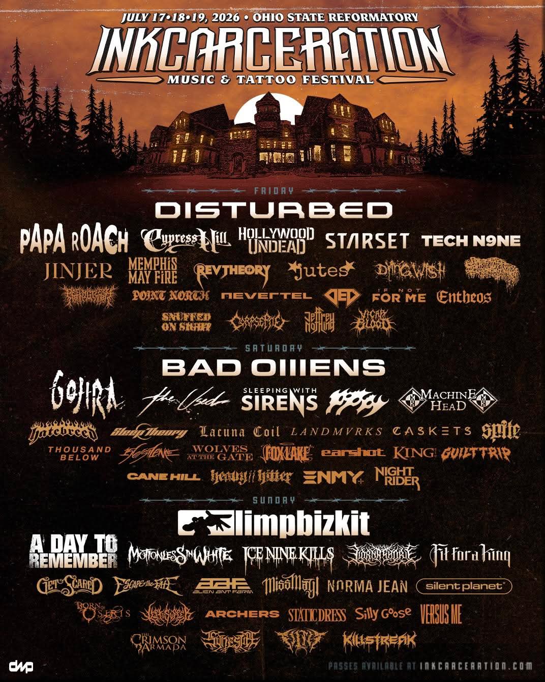 The lineup has officially been revealed for this year’s Inkcarceration Music & Tattoo Festival. The event will be held at the Ohio State Reformatory in Mansfield, OH on July 17-19 and it will feature the following: