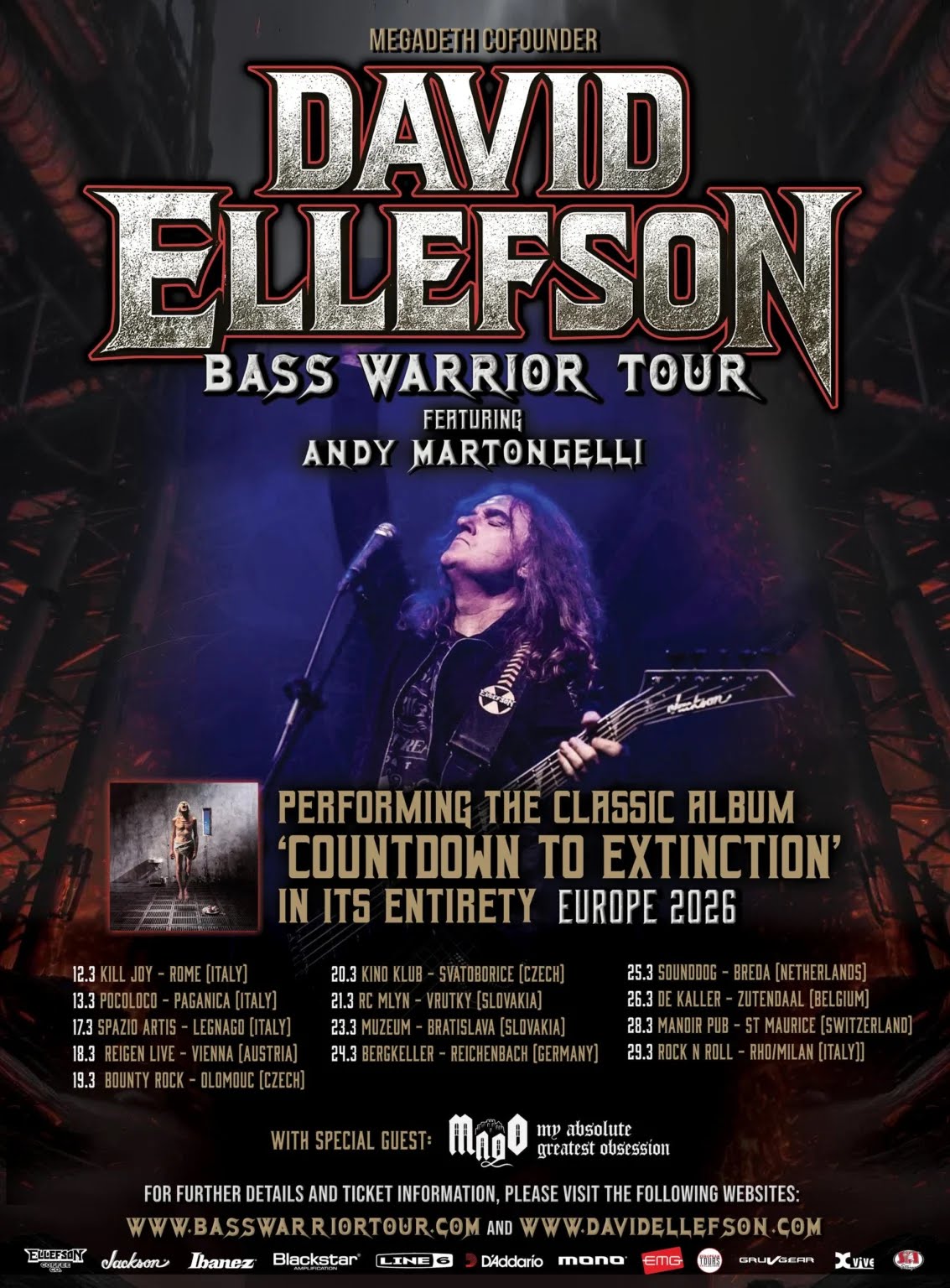 David Ellefson (ex-Megadeth, etc.) has announced another “Bass Warrior” European tour. The trek will find the bassist performing Megadeth’s “Countdown To Extinction” in its entirety alongside other tracks from his catalog and more. Mado will open.