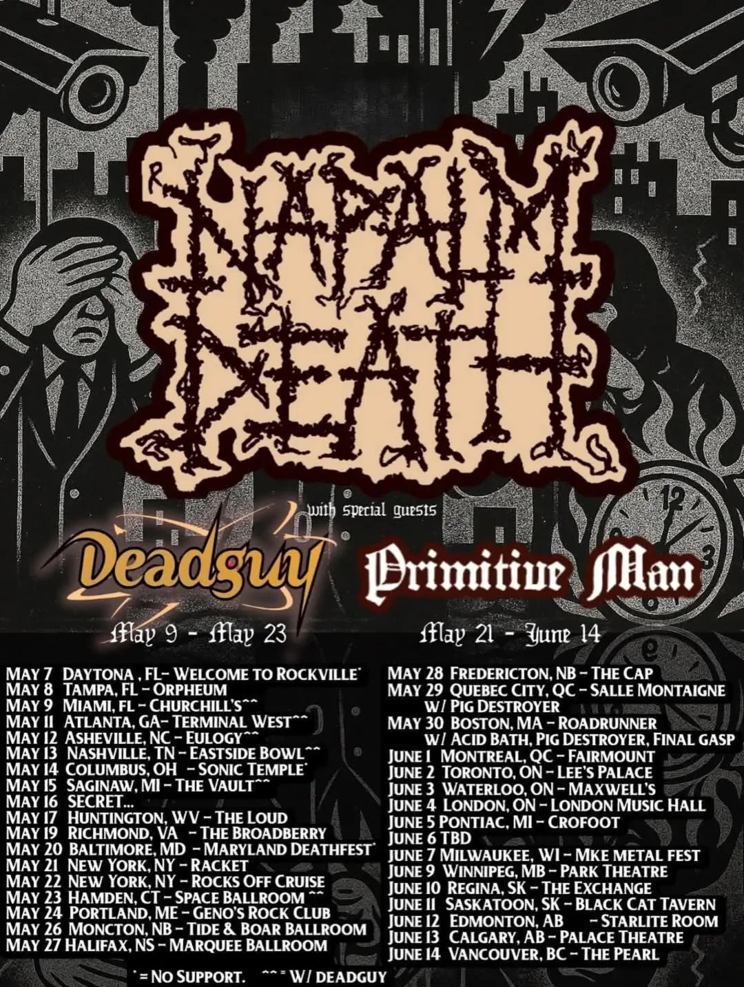 Napalm Death have announced headlining North American tour. Primitive Man and and Deadguy will serve as support on select dates.