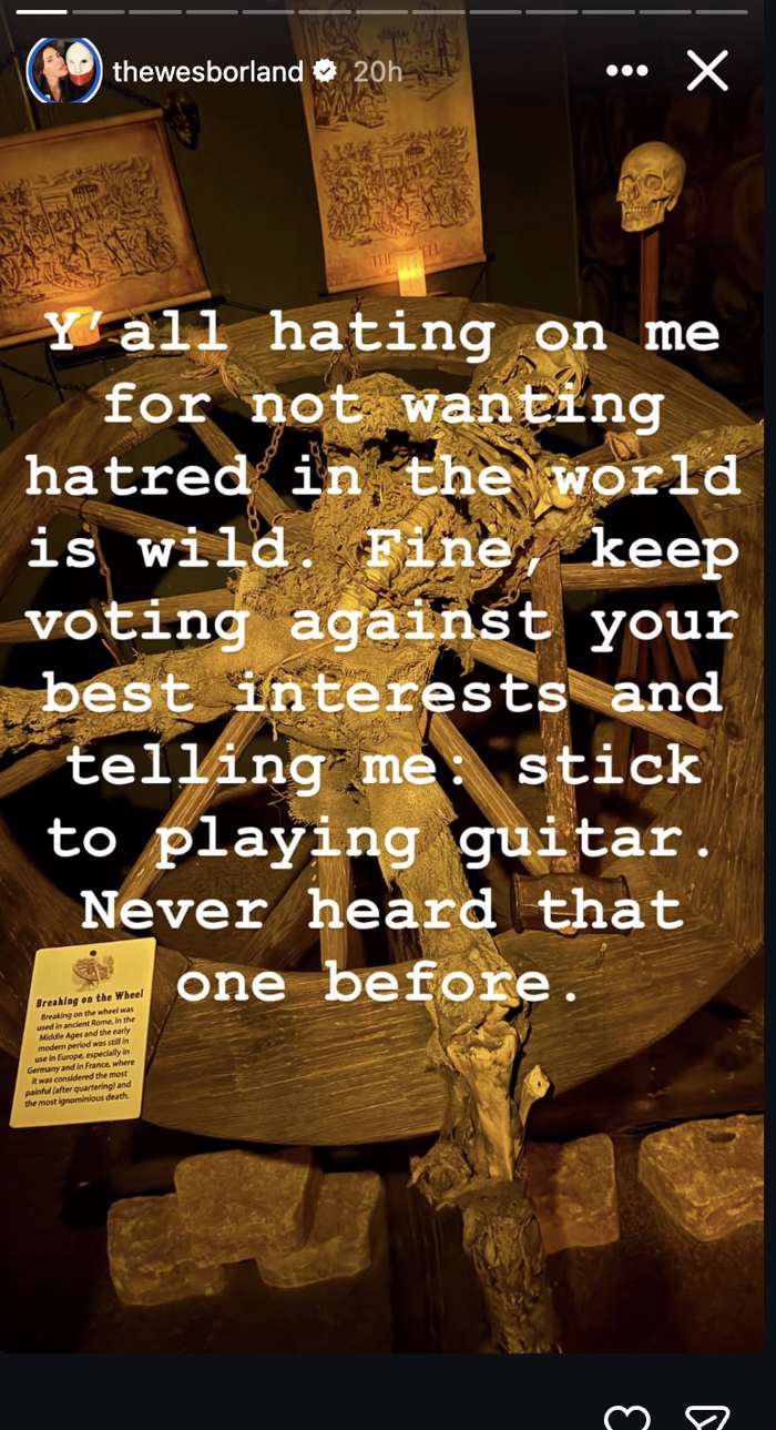 “Y’all hating me for not wanting hatred in the world is wild. Fine, keep voting against your best interests and telling me: stick to playing guitar. Never heard that one before.”
