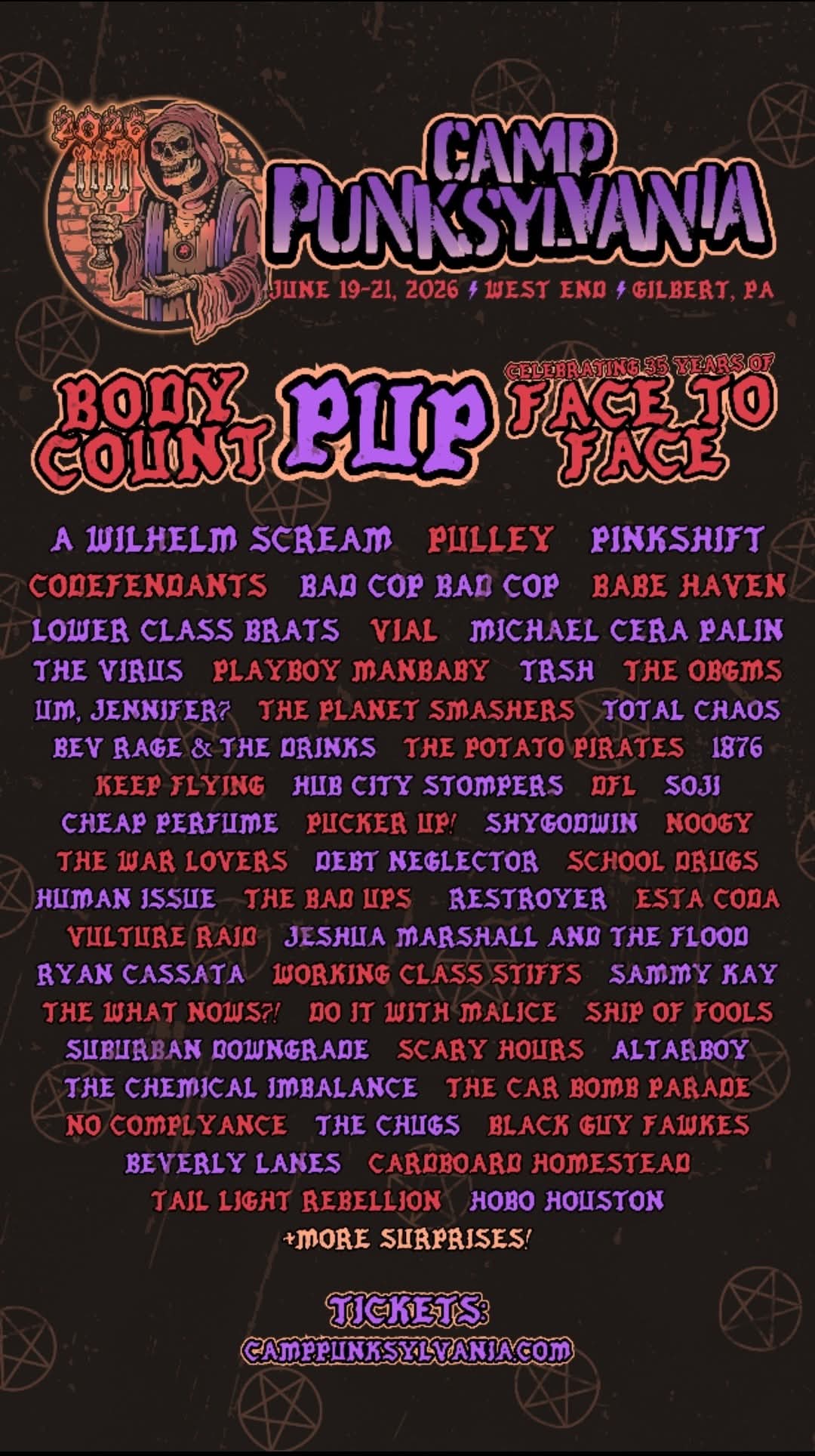 The lineup has been revealed for this year’s Camp Punksylvania festival. The event will take place at West End in Gilbert, Pennsylvania on June 19-21 and it will feature the following: Body Count, PUP, Face To Face, A Wilhelm Scream, Pulley, Pinkshift, Codefendants, Bad Cop/Bad Cop, Lower Class Brats, Babe Haven, Vial, The Virus, Michael Cera Palin, Playboy Manbaby, TRSH, The OBGMs, Um, Jennifer?, The Planet Smashers, Total Chaos, Bev Rage & The Drinks, The Potato Pirates Keep Flying, 1876, Hub City Stompers, DFL, Cheap Perfume, Pucker Up!, Shygodwin, Soji, The War Lovers, Debt Neglector, School Drugs, Human Issue, The Bad Ups, Noogy, Restroyer, Jeshua Marshall And Yhe Flood, Working Class Stiffs, Vulture Raid, Sammy Kay, The What Nows?!, Ryan Cassata, Do It With Malice, Suburban Downgrade, Ship Of Fools, The Chemical Imbalance, Esta Coda, The Car Bomb Parade, Scary Hours, No Compliance, The Chugs, Altarboy, Black Guy Fawkes, Beverly Lanes, Cardboard Homestead, Tail Light Rebellion, and Hobo Houston. Tickets can be found HERE.