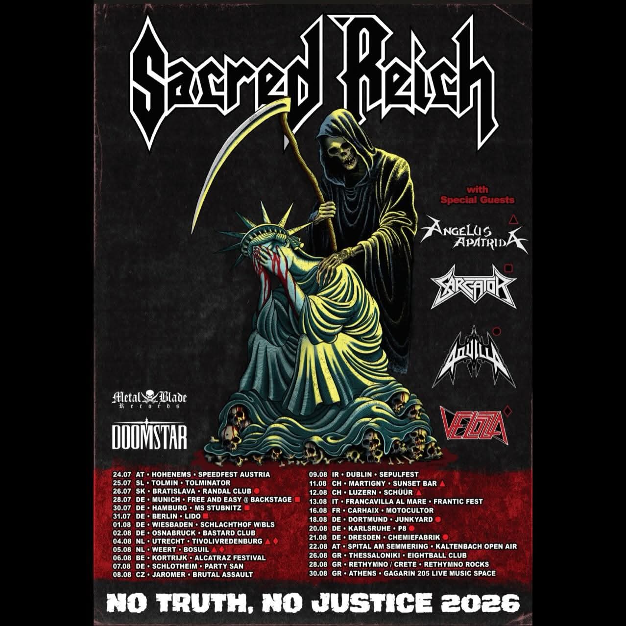 Sacred Reich have announced a summer European tour. Angelus Apatrida, Sarcator, Aquilla, and Velozza will open on select dates.