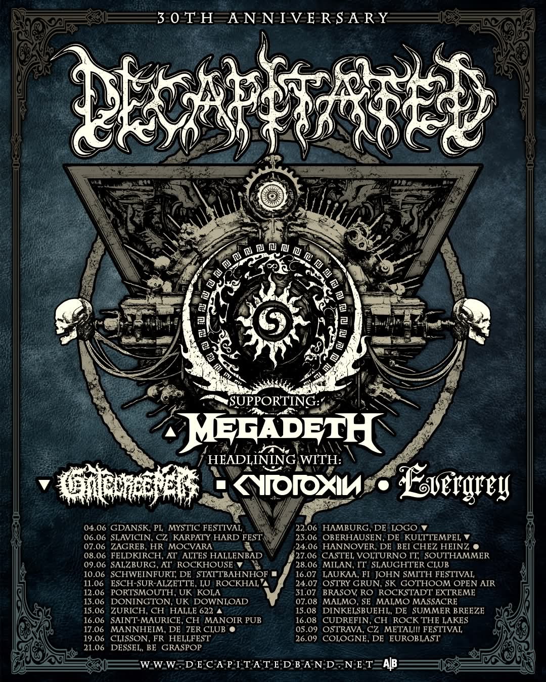 Decapitated have announced a 30th anniversary European/UK tour. Gatecreeper, Cytotoxin, and Evergrey will open on select dates. Two shows will also find the band supporting Megadeth.
