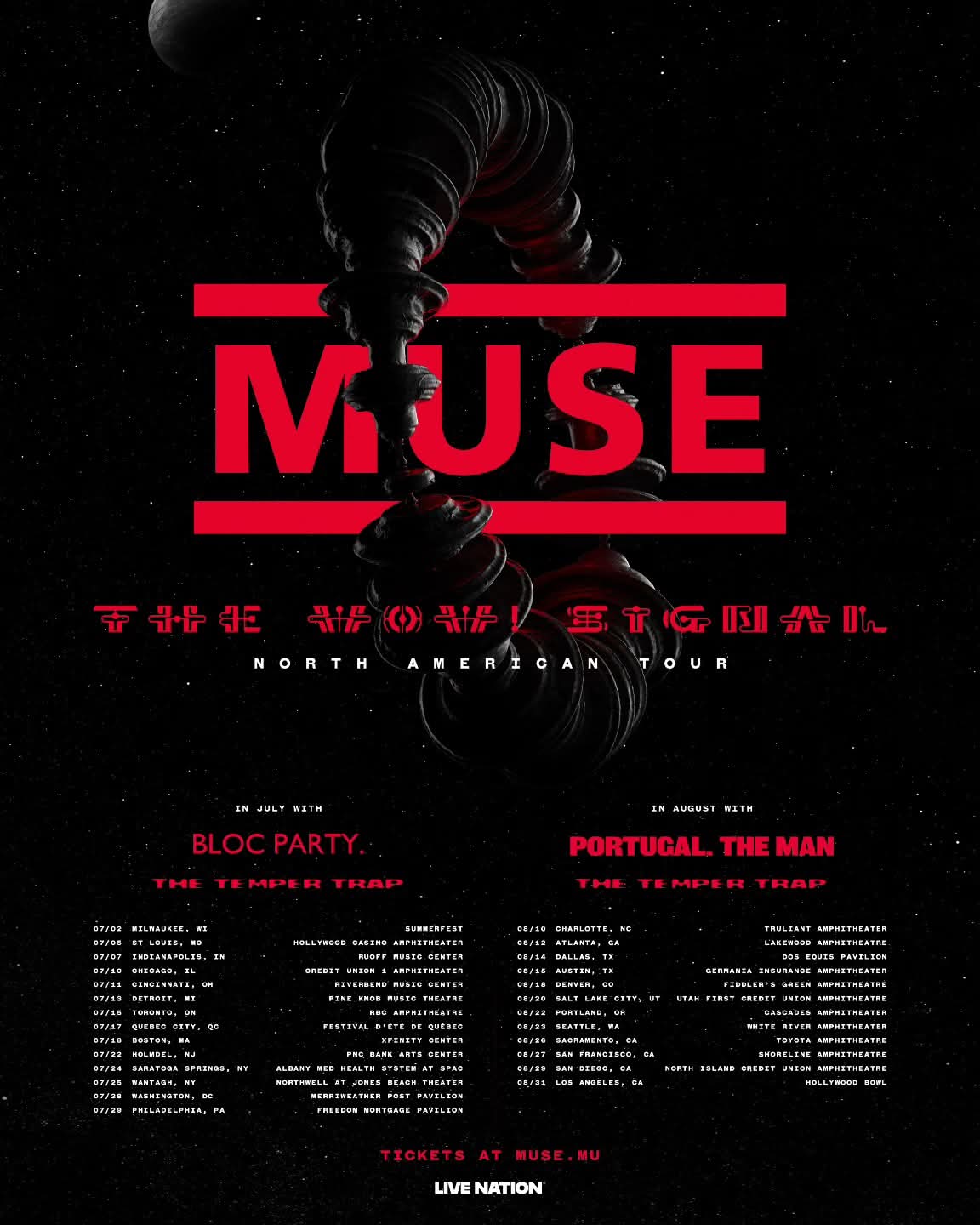 Muse have announced a North American tour in support of their new album “The WOW! Signal” (out June 26). Temper Trap, Bloc Party, and Portugal. The Man will also join the band on select dates.