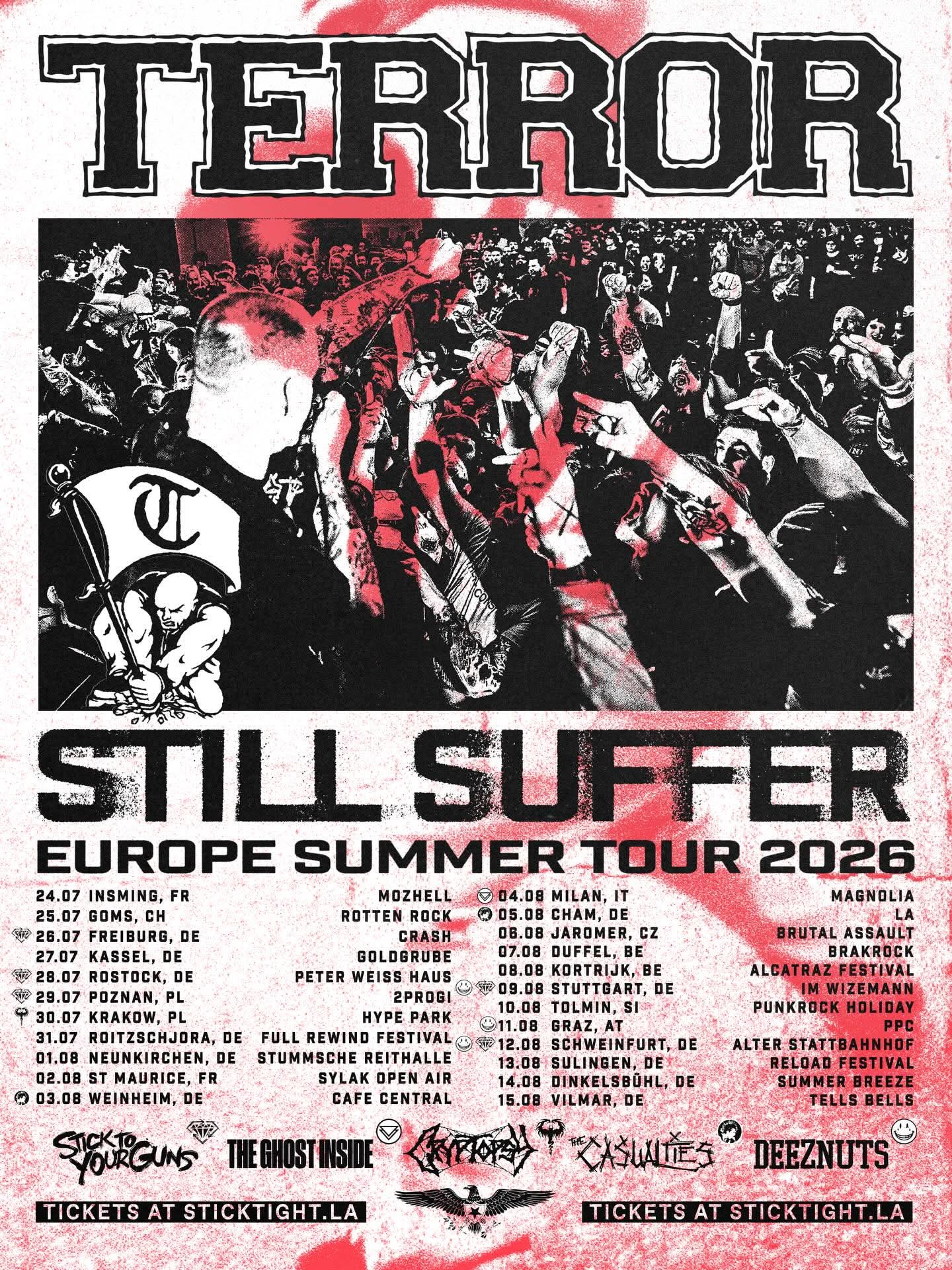 Terror have announced a summer European/UK tour. Select dates will find the band performing alongside Stick To Your Guns, Cryptopsy, The Ghost Inside, Deez Nuts, and The Casualties.