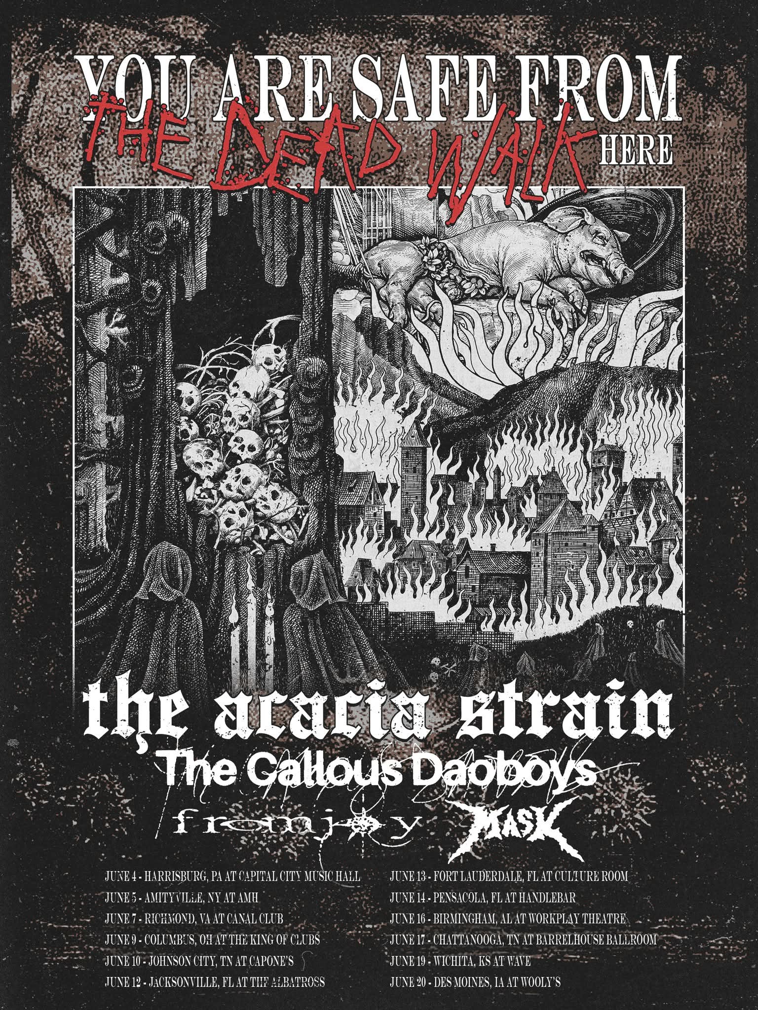 The Acacia Strain have announced their “You Are Safe From The Dead Walk Here” tour. The trek will find the band promoting their latest album “You Are Safe From God Here” and the 20th anniversary of “The Dead Walk.” The Callous Daoboys, Fromjoy, and Mask will serve as support.
