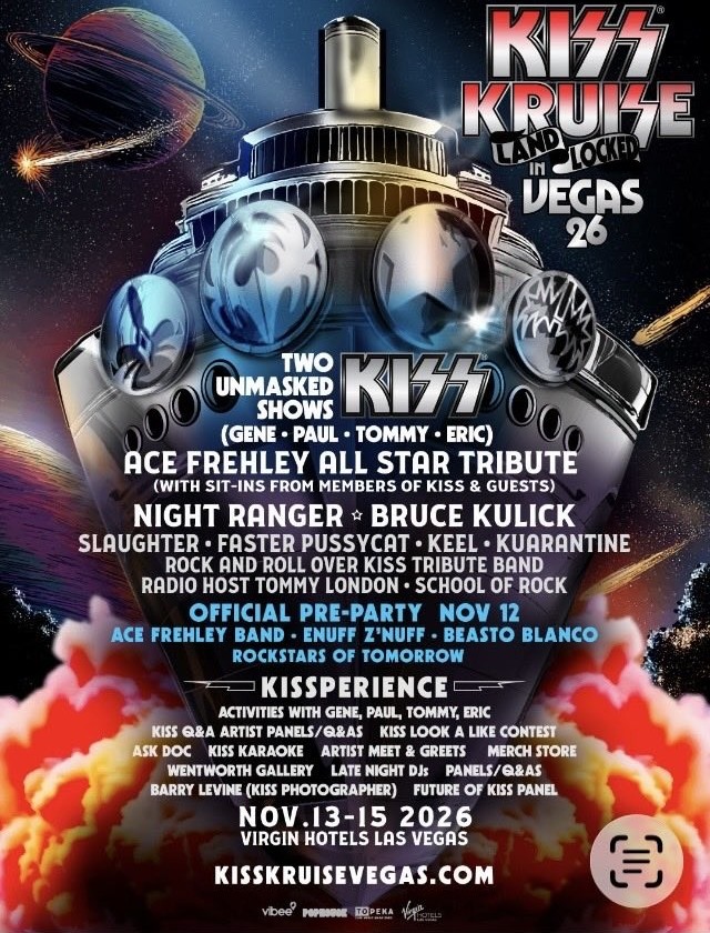 The lineup has been revealed for this year’s “KISS Kruise: Landlocked In Vegas” event. That convention will take place at Virgin Hotels in Las Vegas, NV on November 13-15 and it will find KISS playing two “unmasked” shows. An Ace Frehley all-star tribute band, Night Ranger, Bruce Kulick, Slaughter, Faster Pussycat, Keel, Kuarantine, the Rock And Roll Over KISS tribute band, Tommy London, and the School Of Rock will take part as well. A November 12 pre-party will also feature the Ace Frehley band, Enuff Z’Nuff, Beasto Blanco, and Rockstars Of Tomorrow.